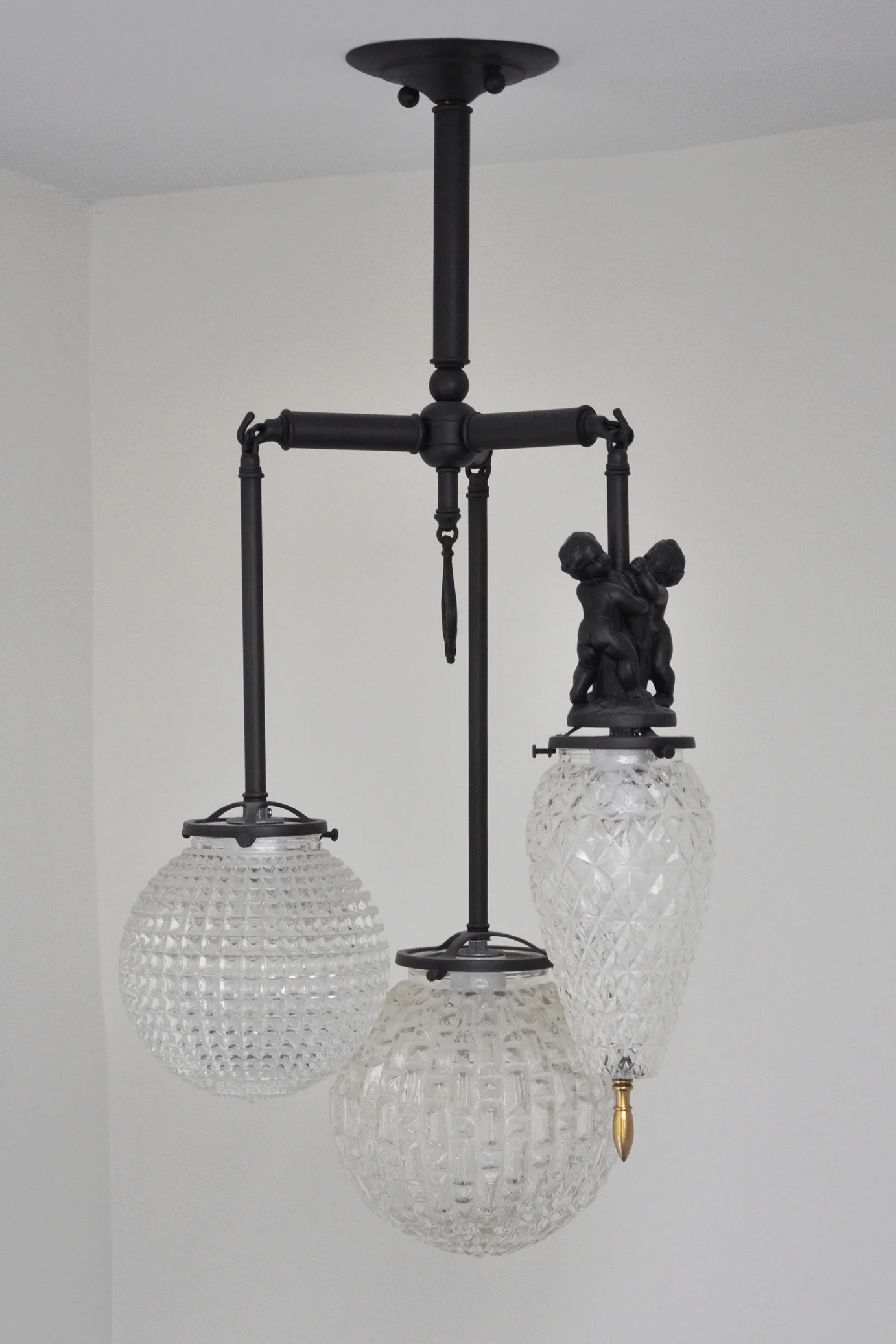 MATERIALS: brass, UL listed electrical components, 3 vintage glass globes, vintage brass elements